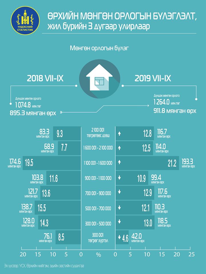 Өрхийн нийгэм, эдийн засгийн 2019 оны гуравдугаар улирлын судалгаагаар нэг өрхийн сарын дундаж мөнгөн орлого 1.3 сая төгрөг болж, өмнөх оны мөн үеэс 189.2 (17.6%) мянган төгрөгөөр өслөө.