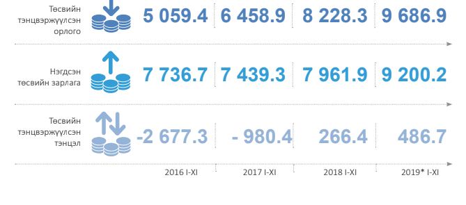 Улсын төсвийн тэнцвэржүүлсэн орлого, тусламжийн нийт хэмжээ оны эхний 11 сарын урьдчилсан гүйцэтгэлээр 9.7 их наяд төгрөг, зарлага, эргэж төлөгдөх цэвэр зээлийн нийт хэмжээ 9.2 их наяд төгрөг болж, тэнцвэржүүлсэн нийт тэнцэл 486.7 тэрбум төгрөгийн ашигтай гарлаа.
