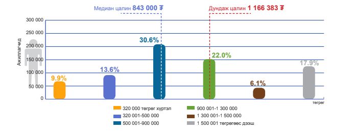Нэг ажилтанд ногдох сарын дундаж цалин энэ оны гуравдугаар улирлын байдлаар 1 166 383 байгааг Үндэсний статистикийн хорооноос мэдээллээ. Харин МЕДИАН цалин 843 000 төгрөг байна. Медиан цалин гэдэг нь ажиллагсдын цалинг өсөх эсвэл буурах эрэмбээр байршуулсан цувааг таллан хувааж тооцож байгаа цалин гэж мэргэжилтэн тайлбарлалаа.