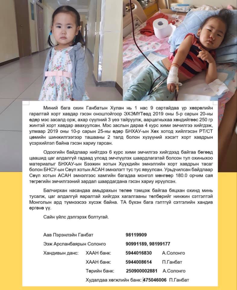 Иймд охины ээж, аав хандивын аян зарлалаа. Халуун сэтгэлтэй Монгол хүн бүрийг Г.Хулан охины эмчилгээний төлбөрт сэтгэлийн хандив өргөхийг уриалж байна.