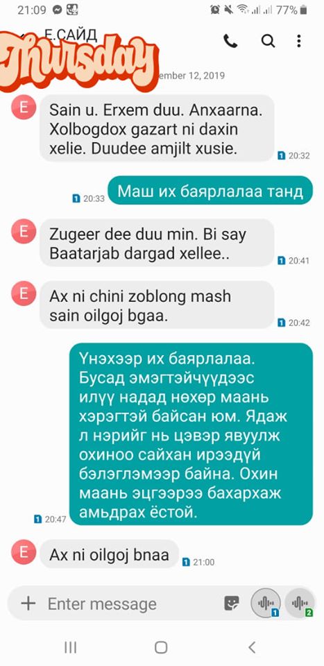 Тэгвэл Шүүх, шинжилгээний дүгнэлтийг дахин гаргах шинжээчдийн хариу хэзээ гарах талаар Ерөнхий сайдын утас руу мессеж бичин асууснаа цахим хуудаснаа нийтэлжээ.