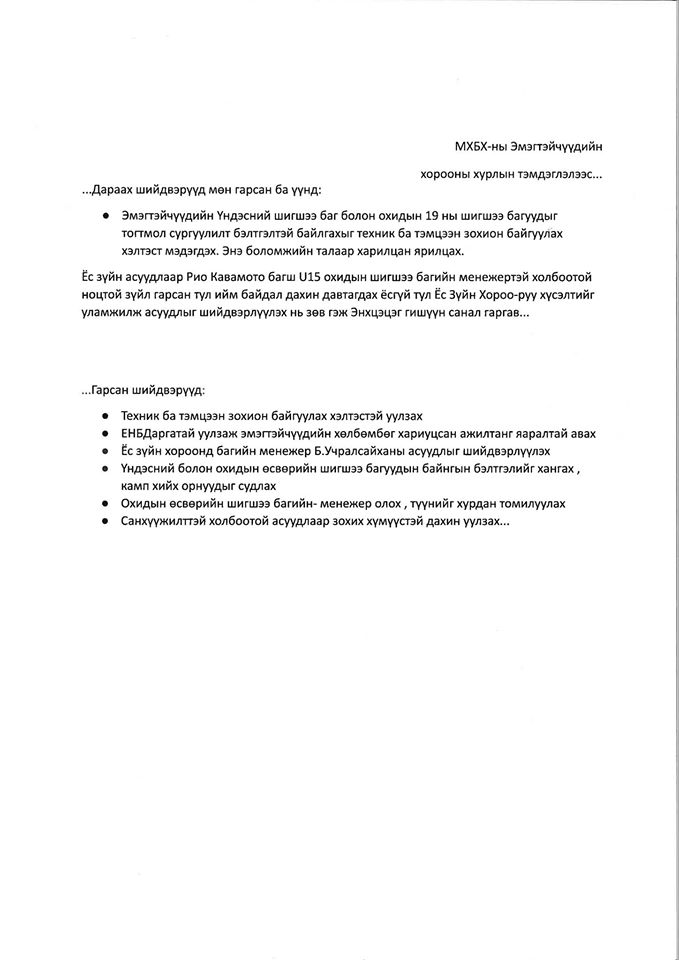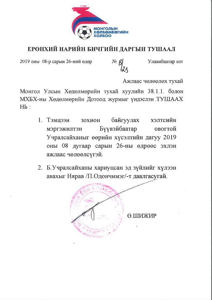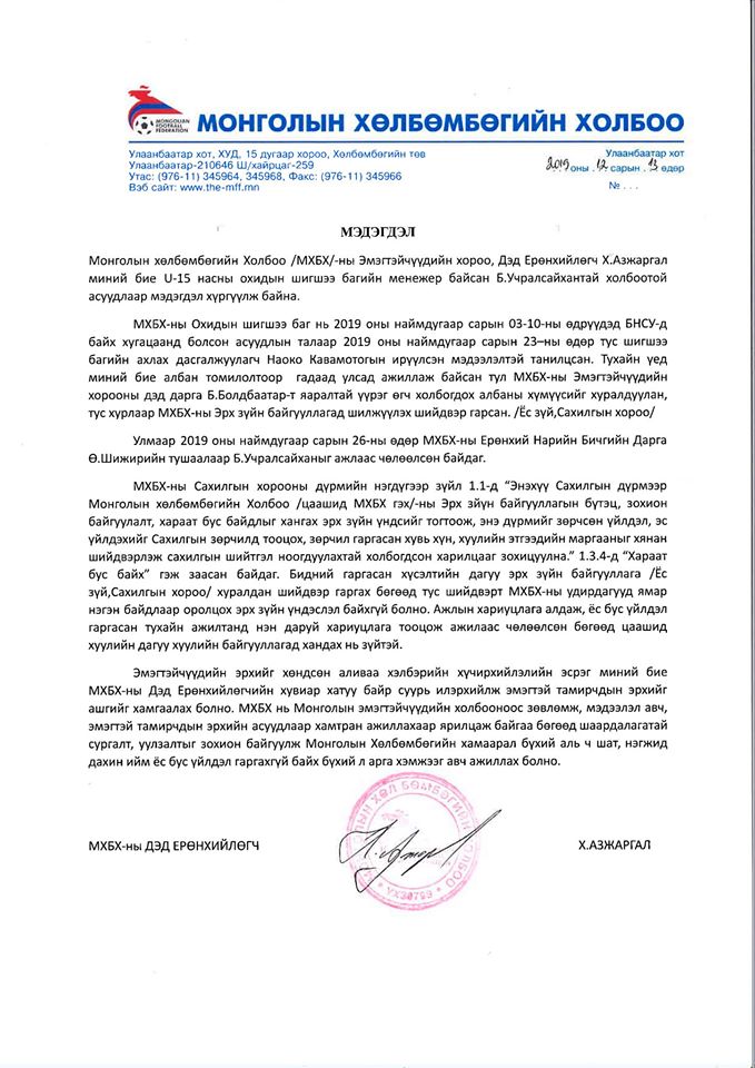 Монголын Хөлбөмбөгийн холбоо /МХБХ/-ны U-15 охидын шигшээ багийн менежер Бүүвэйбаатарын Учралсайханыг шигшээ багийн охидтой зүй бусаар харьсан гэх мэдээлэл зарим хэвлэлээр гарсан. Үүнтэй холбогдуулан МХБХ-ны Эмэгтэйчүүдийн Хороо, Дэд ерөнхийлөгч Х.Азжаргал мэдэгдэл гаргалаа.