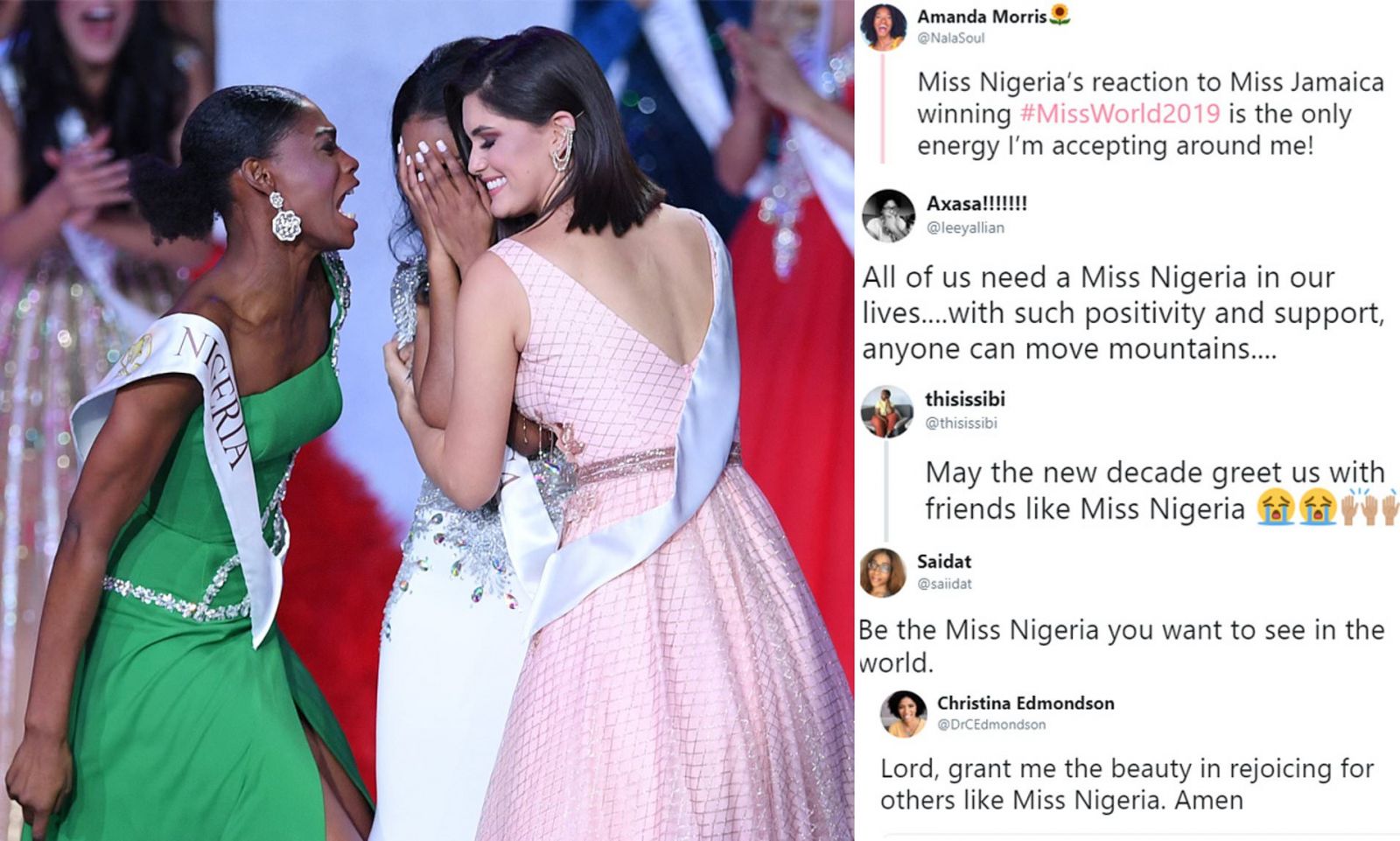 Твиттер хэрэглэгчид "Нигерийн мисс шиг найзтай болох"-ыг хүсэж буйгаа илэрхийлсэн бол зарим нь "Түүн шиг найз байж чадна" хэмээн жиргэжээ. "Гоо үзэсгэлэнгийн хатан хаан бусдын ялалтад баярлаж буй агшныг нулимс дуслуулан үзлээ" гэх нэгэн байхад "Нигерийн мисс энэ тэмцээний хамгийн шилдэг нь байлаа" гэж хүмүүс сэтгэгдлээ хуваалцжээ. “2020 онд найз чинь шинэ бизнес, ямар нэгэн шинэ зүйл эхлэхэд Нигерийн мисс шиг байгаараа” хэмээн нэгэн хэрэглэгч мөн жиргэжээ. Нэг ёсондоо энэ дэлхийн хамгийн сайхан бүсгүйчүүд өрсөлдсөн тэмцээнд Ямайкын гоо бүсгүй түрүүлсэн ч өөр нэг "ялагч" нь сайхан сэтгэлтэй Нигер бүсгүй болж чадлаа. Түүнийг дэлхий нийт түрүүлсэн бүсгүйгээс дутуугүй хайрлан, талархлын үгс зориулсаар байна.
