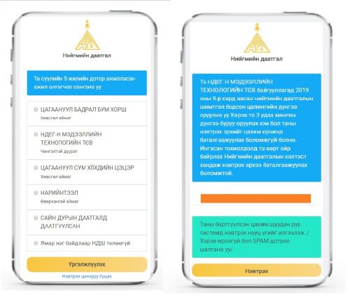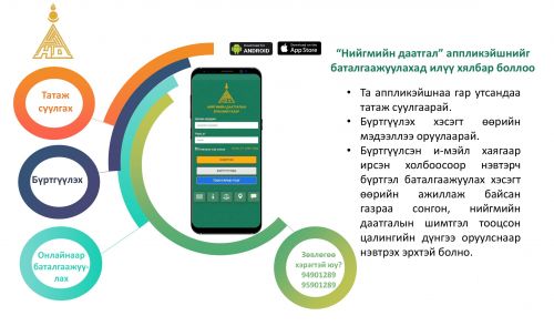 Мөн app@ndaatgal.mn мэйл хаяг руу бичиг баримтынхаа зургийг илгээж, эсвэл өөрт ойр байрлах Нийгмийн даатгалын хэлтэст очин баталгаажуулах боломж нээлттэй. Бүртгүүлэх болон баталгаажуулахад асуудал гарах, эсвэл мэдээлэл зөвлөгөө шаардлагатай бол 94901289, 95901289 дугаарын wechat, viber ашиглан бүртгэл баталгаажуулах ажилтантай холбогдоорой.