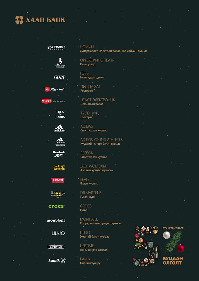Эрхэм харилцагч та ХААН Банктай хамтран ажилладаг томоохон худалдаа, үйлчилгээний байгууллагуудаар үйлчлүүлэхдээ ХААН Банкны кредит картаа ХААН Банкны карт уншигч ПОС төхөөрөмж дээр уншуулаад үнийн дүнгийн 5%-ийг буцаан аваарай*.
