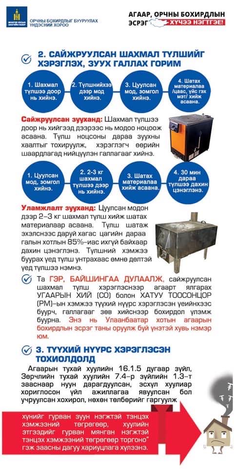 СХД-ийн төрийн албан хаагчид гэр хорооллын айлуудаар явж сайжруулсан түлшний зөв хэрэглээний зөвлөмжийг хоёр удаа тараав. Мөн хариуцсан хорооддоо ажиллаж гэртээ байгаа хүүхдүүдэд сайжруулсан түлшний талаар мэдээлэл хүргэн ажиллаж байгаа аж.