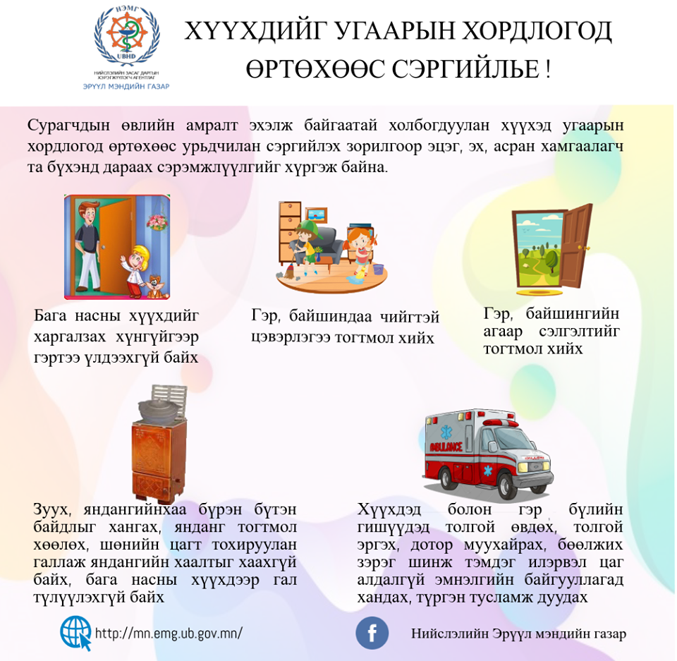 Сурагчдын өвлийн амралт эхэлж байгаатай холбогдуулан хүүхдийг угаарын хийн хордлогод өртөхөөс урьдчилан сэргийлэх зорилгоор эцэг эх, асран хамгаалагч та бүхэнд дараах сэрэмжлүүлгийг хүргэж байна.