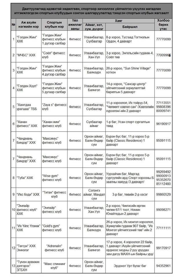 Эрүүл мэндийн даатгалын ерөнхий газраас даатгуулагчдыг идэвхтэй хөдөлгөөн, спортоор хичээллэх үйлчилгээнд хамруулах магадлан итгэмжлэгдсэн спортын клубын сонгон шалгаруулалтын материалыг 2019 оны 11-р сарын 28-наас 2019 оны 12-р сарын 20-ны хугацаанд хүлээн авч, шалгаруулжээ. Шалгаруулалтад 13 спорт клуб тэнцсэн байна.