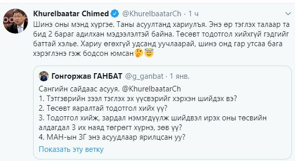 Тэгвэл Монгол Улсын Сангийн сайд Ч.Хүрэлбаатар энэ талаар тодорхой мэдээлэлгүй байгаа аж. Иргэн Г.Ганбат Сангийн сайдаас тэтгэврийн зээл тэглэх эх үүсвэрийг олохын тулд төсөвт тодотгол хийж, зардлаа нэмэгдүүлэх үү гэж асуухад “Энэ өр тэглэх талаар та бид хоёр бараг адилхан мэдээлэлтэй байна. Төсөвт тодотгол хийхгүй гэдгийг баттай хэлье” гэж хариулсан байна.