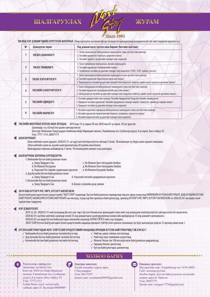 Төслийн материалыг 2019 оны арванхоёрдугаар сарын 20-оос, 2020 оны нэгдүгээр сарын 20-ныг дуустал цахим myf@myf.mn хаягаар болон өөрсдийн биеэр Монголын Залуучуудын Холбооны төв байранд авчирч өгөх бөгөөд 7777-1313, 80057771 утсанд холбогдон хүргэх боломжтой юм байна.