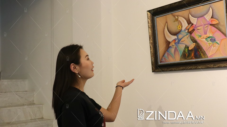 -Энэ үзэсгэлэн миний багштайгаа хамтарч гаргаж буй анхны үзэсгэлэн. “Урлах эрдэм” дээд сургуульд арьсан урлагийн “А” үсэг анхлан заасан Ч.Алтанчимэг багшийн маань дотоод ертөнц гэгээн санагддаг. Миний хувьд ертөнц гэдэг хүний бодлын хязгаараас давсан агуу том зүйл юм. Ертөнцийг танихын хэрээр хүн хумхын тоос мэт өчүүхэн жижиг гэдгээ мэдэрнэ. Ургамал амьтан, хүн бол ертөнцийн салшгүй нэг хэсэг бөгөөд тэдгээр нь гадаад төрхөөрөө өөр юм шиг хэр нь дотоод мөн чанар нь ижил байдаг. Тиймээс ертөнц гэдэг маш олон зүйлийн нэгдэл юм. Хүний амьдрал маш удаан үргэлжилдэг мэт боловч эцсийн цэг дээр очоод эргээд харахад маш богинохон, зүүд зэргэлээ шиг  байдаг учраас бие биеэ хайрлаж, нэгэн цул байя гэсэн санааг бүтээлдээ илэрхийлэхийг зорьсон. Өнөөдөр Монгол Улсад эв нэгдэл, нэг зорилго чухал хэрэгтэй байна. Энэ санаа ч цухалзаж буй. Үзэсгэлэн маань энэ сарын 28 хүртэл нээлттэй.