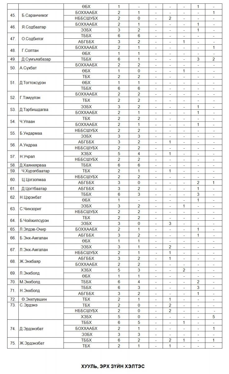 Өнгөрөгч сард буюу 2019.12.01-нээс 2019.12.31-ний өдрүүдийн байнгын хорооны ирцийн мэдээгээр УИХ-ын гишүүн С.Жавхлан, Б.Наранхүү нар байнгын хороодын хуралдаанд огт суугаагүй байна. УИХ-ын гишүүн С.Жавхлан ганц БОХХААБХ-нд харьяалагддаг бөгөөд өнгөрөгч сард тус байнгын хороо хоёр удаа хуралдахад эрхэм гишүүн өвчтэй, дотоод томилолттой гэсэн шалтгаанаар суугаагүй аж. Харин УИХ-ын гишүүн Б.Наранхүү АБГББХ, ӨБХ, ТБХ гэсэн гурван байнгын хороонд харьяалагддаг бөгөөд өнгөрөгч арванхоёрдугаар сард дээрх байнгын хороод зургаан удаа хуралдахад эрхэм гишүүн таван удаа шалтгаангүй тасалж, нэг удаа дотоод томилолттой гэсэн шалтгаанаар хуралд суугаагүй юм байна.