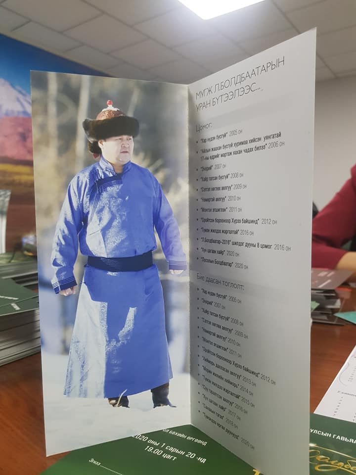 “Хар нүдэн бүсгүй”, “Нөмөртэй аялгуу”, “Хун цагаан хайр” зэрэг 12 цомог гаргаж,  “Хар нүдэн бүсгүй”, Сэтгэл хөглөх аялгуу”, “Санахын гэгээ” зэрэг 13 тоглолтоо хийсэн тэрбээр ийнхүү 14 дэх тоглолтоо түмэндээ өргөн барих гэж байна.