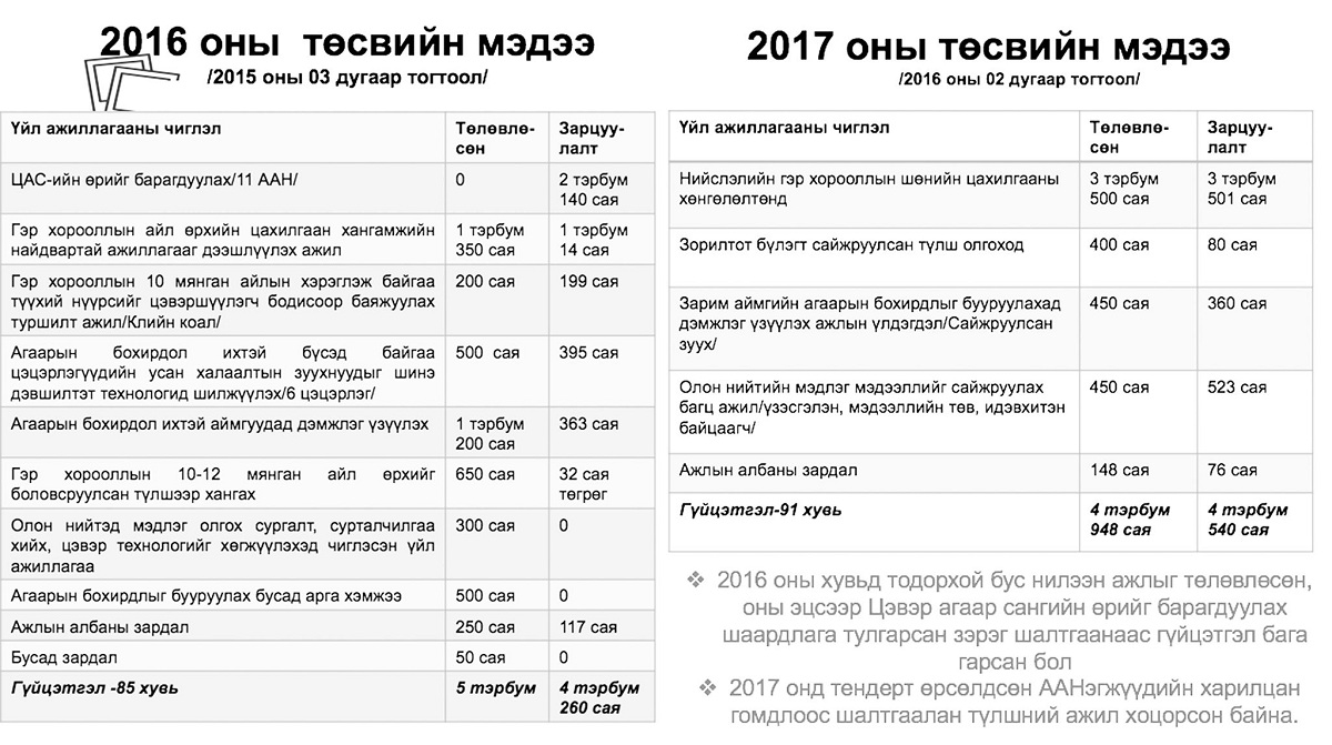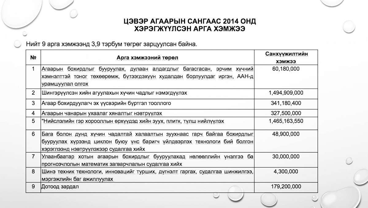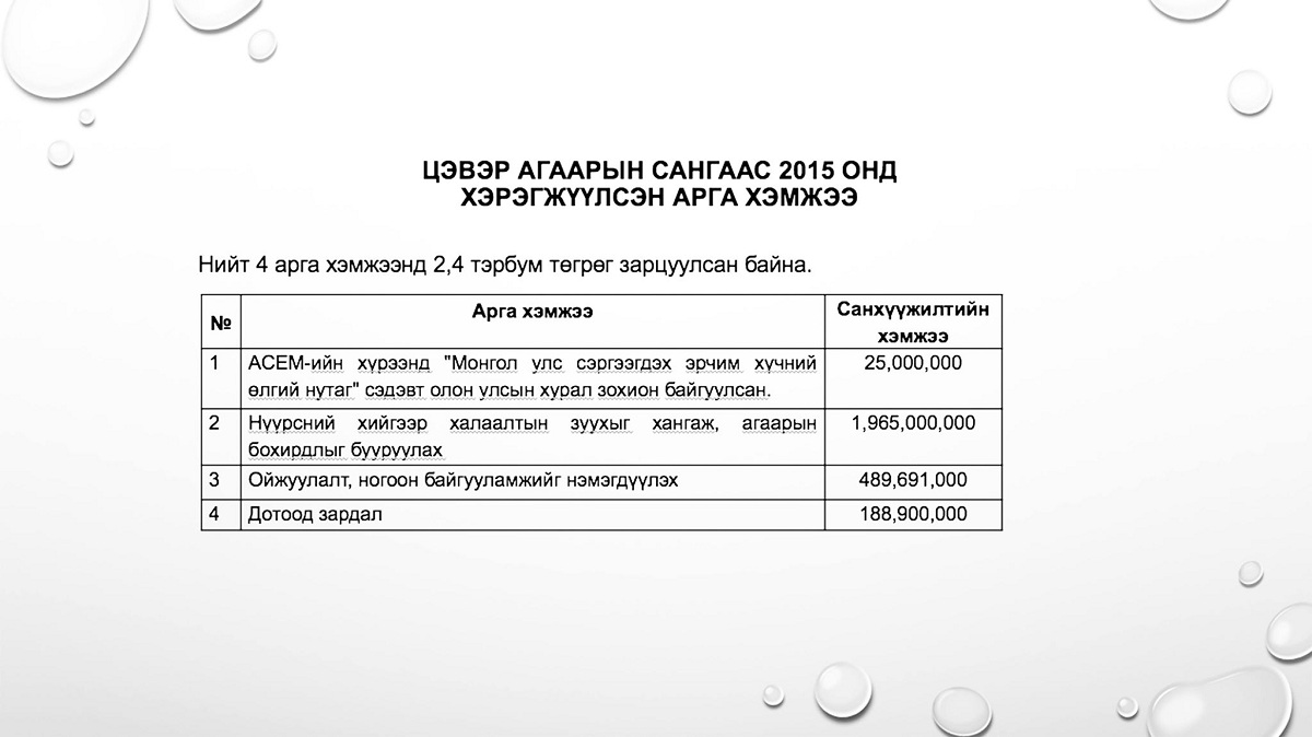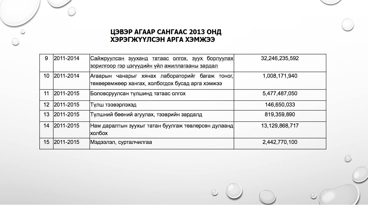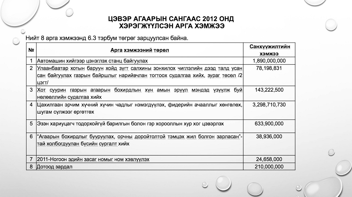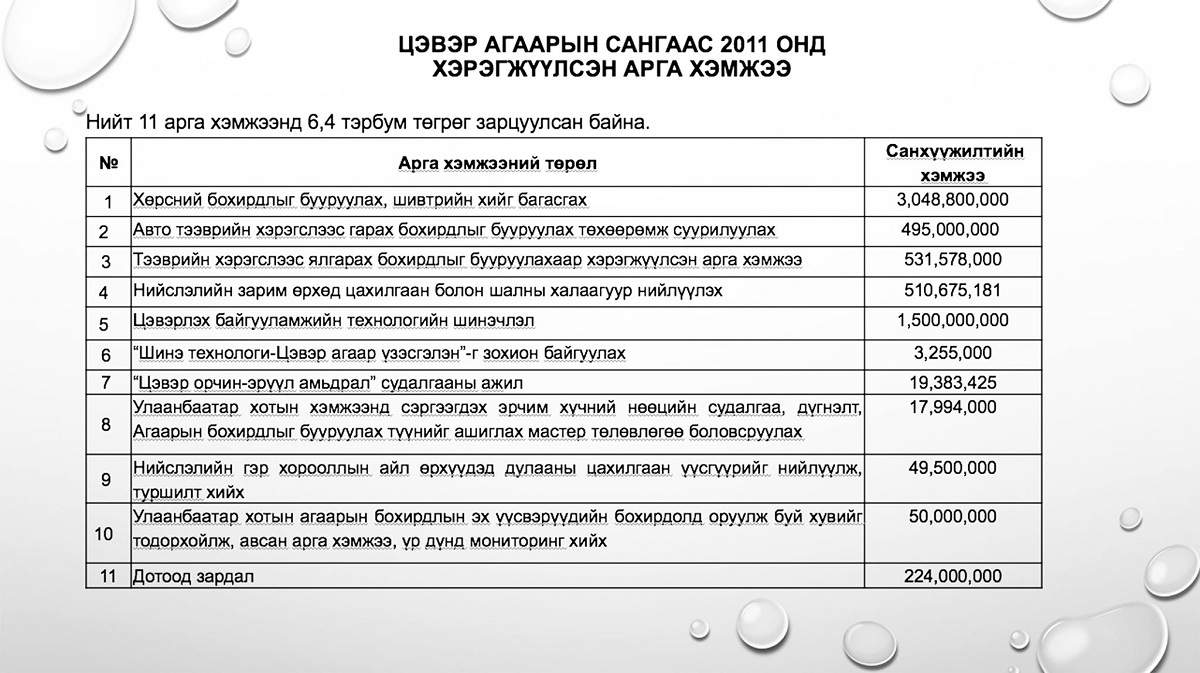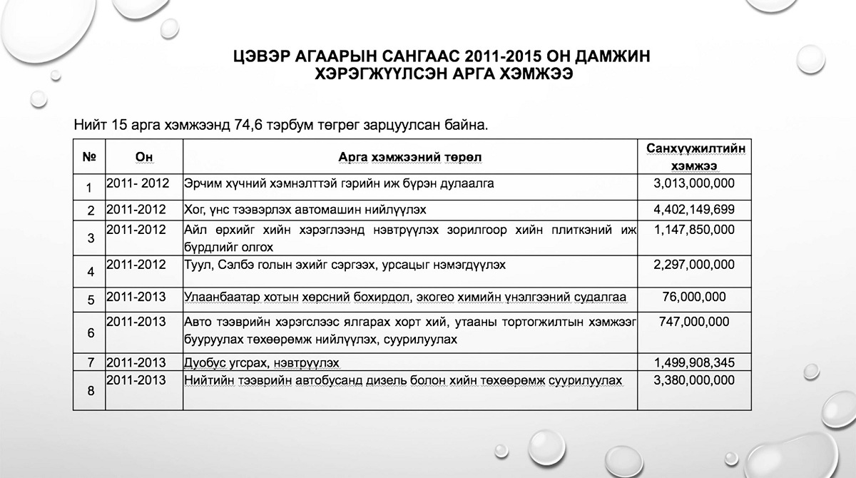 Энэ тухай олон зүйл нуршилгүй баримт дэлгэх нь зүйд нийцнэ. Тухайлбал, Ногоон эдийн засаг гэх ном хэвлүүлэхэд 24 сая 658 мянган төгрөг, Автомашин хийгээр цэнэглэх станц байгуулахад нэг тэрбум 890 сая төгрөг, утаа хүний эрүүл мэндэд хэрхэн нөлөөлж байгаа тухай судалгаа хийхэд 143 сая төгрөг гэх мэтээр мөнгө цацаж байв. Мөнхүү бүсийн сургалт нэрээр 36 сая, аймгийн төвүүдэд агаарын бохирдлыг бууруулах арга хэмжээ хэрэгжүүлэхэд 706 сая, агаарын бохирдлыг бууруулах тоног төхөөрөмж худалдан борлуулдаг Аж ахуйн нэгжүүдэд урамшуулал олгох нэрээр 197 сая 470 мянган төгрөг, агаар бохирдуулагч эх үүсвэрийн тооллогод 341 сая 180 мянган төгрөг гэх мэт суртал сурталчилгаа, ухуулгын чиглэлд асар их мөнгө зарсан байдаг. Түүнээс бус энэ байгууллага агаарын бохирдол бууруулах ямар ч бодит ажил хийгээгүй юм. Зөвхөн 2011-2015 онд нийт 74.6 тэрбум төгрөгийг суртал сурталчилгаа, мониртинг хурал зөвлөгөөн гэсэн зүйлд зарцуулсан юм.