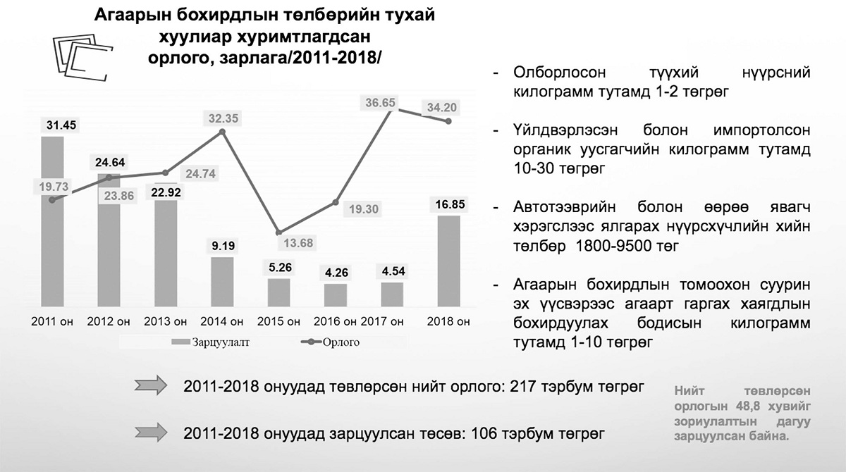 Энэ салбараар дамжиж гарсан ихээхэн хэмжээний хөрөнгийн эх үүсвэр, зарцуулсан тайланг иргэд олон нийт нэхсээр байгаа. Тиймээс УИХ-ын Өргөдлийн байнгын хорооноос иргэдээс ирүүлсэн өргөдлийн дагуу Агаарын бохирдлыг бууруулахад зарцуулсан хөрөнгийн талаар албан тушаалтнуудаас тайлбар авах хэлэлцүүлгийг зохион байгуулсан. Агаарын бохирдлыг бууруулах зорилгоор жил бүр улсын төсөвт хөрөнгө суулгадаг боловч зориулалтын дагуу зарцуулагдахгүй байгаа талаар иргэд, байгууллагаас өргөдөл, хүсэлт ирүүлсээр байна.