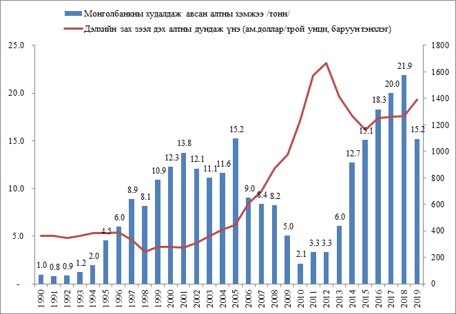 Монголбанк 2019 онд 15.2 тонн үнэт металл худалдан авсан нь 2018 оныхоос 6.7 тонн буюу 30%-иар буурсан үзүүлэлт байгаа юм. Алт нь шууд валютаар арилжаалагддаг учир валютын нөөцийг нэмэгдүүлэх хамгийн чухал үнэт металл гэдгийг тодотгоё.