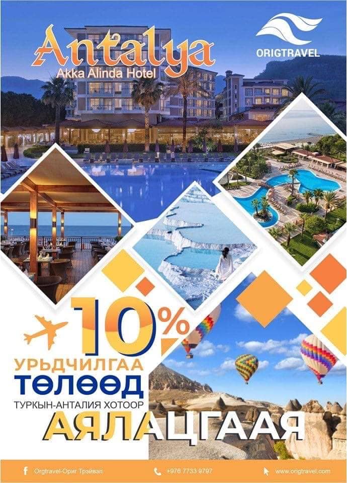 Ийнхүү адал явдал дүүрэн аялал маань Туркийн үзэсгэлэнт хот Антальягаас эхэлсэн юм. Бидэнд тав тухтай аялах боломжийг дэлхийн аялал жуулчлалын хамгийн эрэлттэй чиглэл болох Туркийн далайн эргийн боомт, амралт, аялал сувиллын хот Анталья, дэлхийн найм дахь гайхамшиг гэгддэг хөвөн цайз хэмээн алдаршсан Памуккале руу хийдэг аяллаараа Монголд тэргүүлдэг “Ориг Трэйвэл” компани олгосон. Турк улсын байгалийн сайхныг бишрэн, Газар дундын тэнгисийн зөөлөн давалгаанд салхиар илбүүлэн хөлөг онгоцоор зугаалж, эртний Ромын хот Хиераполисоор зочилж, алдарт Клеопатрагийн рашаанд орж 10 насаар залуужих боломжийг бидэнд олгохын зэрэгцээ аялагчдын тав тух, аюулгүй байдлыг дээд зэргээр хангаж, хөтөч, орчуулагчаар бидэнд тусалсан “Ориг Трэйвэл” компанидаа баярлалаа.