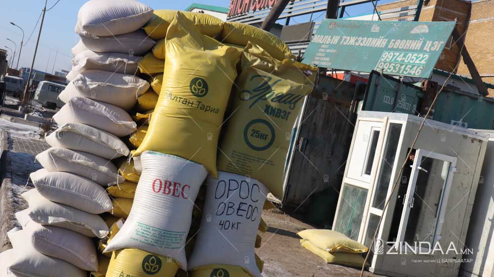 Цааш бид өвс, тэжээлийн төвлөрсөн худалдааны хашаанаас гараад зүүн тийш “5 шар”-ын “Энхжин” худалдааны төвөөс эхлээд зам дагуу байдаг овьёос, хивэг, будаа зардаг цэгүүдээр орж, үнэ сонирхлоо. Хамгийн зүүн захад байрлах худалдааны цэгт 40 кг савлагаатай орос овьёос 34 мянган төгрөг, 25 кг орос овьёос 28 мянга, “Алтан тариа” үйлдвэрийн хивэг 25 килограммтай нь 15 мянга, адил хэмжээний орос хивэг 13 мянган төгрөгийн үнэтэй байв. Үнийн тухайд худалдагч Г.Эрдэнэгомбо “Бөөндөж их хэмжээгээр авбал 500-1000 төгрөг татаж болно. Өнгөрсөн жилтэй харьцуулахад үнэ жаахан нэмэгдсэн. Иргэд орос, монгол аль алинаас нь л авдаг. Ойрд худалдан авагч цөөн ирж байна. Кантнерт хадгалдаг. Улирал хамаарахгүй зардаг. Халуун, хүйтнээс болж овьёос, хивэг муудна гэсэн юм байхгүй” гэлээ. Биднийг очих өдөр худалдан авагч цөөн байсан учраас “Худалдаа хийх хүн ирэх нь үү” гэж хэсэг хүлээлээ. 20 минут орчим хүлээсний дараа Д.Чанцал гэх иргэн хоёр шуудай хивэг авлаа. Тэднийх Өлзийт хороололд цөөхөн малтай. Хааяа сүү, тараг борлуулахаар хот орж ирдэг гэнэ. Түүнээс хивэг, овьёосны чанарын талаар тодруулахад “Монгол хивэг орос хивэгнээс илүү гурилын найрлага сайтай. Илүү чанартай. Тэгээд ч тэр үү үнэ ганц хоёр мянган төгрөгөөр илүү байдаг. Овьёос ч гэсэн идээнээсээ шалтгаалаад, хог, хаягдал багатай бол зүгээр” гэсэн юм. Энэ хавиас баруун зүг рүү малын тэжээл борлуулдаг цэгүүд үргэлжилнэ. Эндээс 22-ын товчоогоор орж, ирдэг бүх аймаг болон Сүхбаатар, Хэнтий, Дундговь аймгаас ирэх малчид худалдаа их хийдэг байна. Жингээсээ хамаараад гурван төрлийн орос овьёос зарж байлаа. 35 кг нь 28 мянга, 40 кг нь 30 мянга, 50 кг нь 34 мянган төгрөгийн үнэтэй зарагдаж байна. Малд өгдөг будааны хувьд хар үртэй болон цэвэр будаа гэж хоёр төрөл байгаа аж. 40 кг хар үртэй будаа 27 мянган төгрөг, цэвэр нь 34 мянган төгрөгийн үнэтэй. Орос болон “Улаанбаатар”, “Хурх”, “Ургац”, “Алтан тариа” үйлдвэрийн хивэг 12500-14500 төгрөгийн үнэтэй зарагдаж байлаа. Худалдагч Х.Барсхүү “Нэг тоннд 40 ширхэг овьёос, хивэг багтдаг. Үүнээс дээш тооны бүтээгдэхүүн худалдаж авбал хэдэн төгрөг татаад өгнө. Бид үйлдвэрээс аваад ширхгийн үнэ дээр 1000 төгрөг нэмж зардаг. Бөөндөж авбал ширхэг тус бүрээс 500 төгрөг хасаад өгнө. Одоо өвөлжилт жаахан хүнд байгаа аймгуудын малчид цөөхөн тоогоор малын тэжээл авахаар ирж байна. Эсвэл хөдөө байгаа эцэг, эхээ зорих хүмүүс бага багаар авч байна. Энэ үеэр бөөндөж авах нь ховор доо. Хөвсгөл, Өвөрхангай, Завхан, Дундговь аймгийн малчид тэжээл их авч байна. Нутагт нь эндээс үнэтэй зардаг. Учир нь хивэг, тэжээлийг хотоос үйлдвэрээс нь аваад бензин, тээвэрлэлтийн хөлсөө шингээхээр аймаг, суманд нь илүү үнэтэй очдог. Тиймээс хот руу орж ирж байгаа малчид аль болох эндээс тэжээлээ аваад буцахыг зорьдог. “Энхжин”, “Нарантуул” зэрэг худалдааны төвд хивэг, овьёос зарж байгаа хүмүүс үйлдвэрүүдтэй гэрээ хийгээд захиалаад зардаг учраас иймэрхүү худалдаа хийж байгаа хүмүүсийн олонх ченжүүд байгаа. Малчид үйлдвэр гэхээсээ илүү ченжүүдээс л худалдан авалт хийдэг” гэлээ. Биднийг ярилцаж байх үеэр Сэлэнгэ аймгийн Баянгол сумын малчин зургаан шуудай хивэг авлаа. Тэрбээр “Орос, монгол хоёр төрлийн хивэг байна. Монголд үйлдвэрлэсэн “Алтан тариа” үйлдвэрийн хивэгнээс 14500 төгрөгөөр зургаан шуудайг авлаа. Энэ жил үнэтэй байна. Өнгөрсөн жил нэг шуудай хивэг 10-11 мянган төгрөг л гэж байсан. Манай сумаар цас их, хүйт