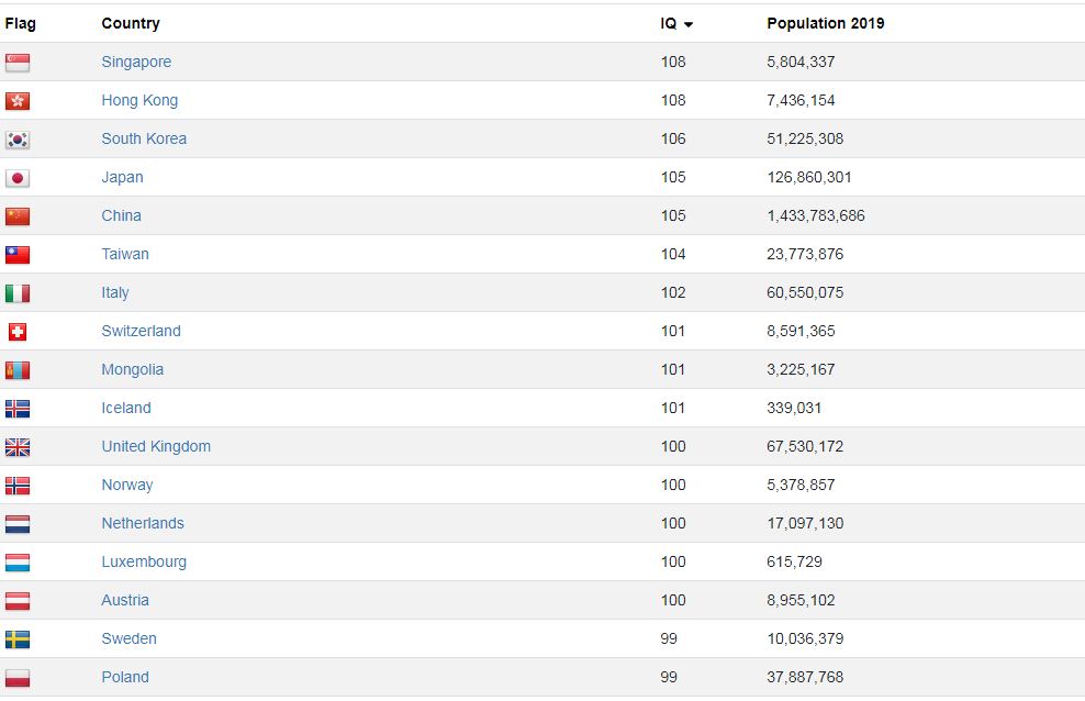 Жагсаалтын эхний аравт бичигдсэн улс орнуудын долоо нь Азийнх байна. Монгол Улс есдүгээрт эрэмбэлэгджээ. IQ хамгийн өндөр улсаар Сингапур тооцогдов.