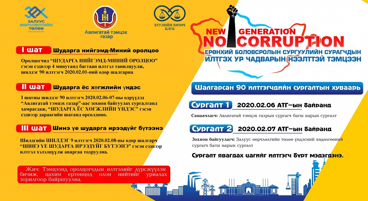 N-NO CORRUPTION" илтгэх ур чадварын нээлттэй тэмцээнийг хүүхдүүд шударга ёсны тухай өөрсдийн үзэл бодлыг чөлөөтэй илэрхийлэх, нийгэмд буй шударга бус байдлын эсрэг дуу хоолойгоо олон нийтэд хүргэх үйл ажиллагааг дэмжих зорилгын дор 2020 оны салхийг хагалж ийнхүү зарлав.