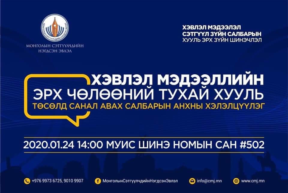 Монголын сэтгүүлчдийн нэгдсэн эвлэлээс зохион байгуулж буй уг хэлэлцүүлэгт хэвлэл мэдээллийн байгууллага, сэтгүүлчдийг идэвхтэй оролцохыг тус эвлэлээс уриалж байна.