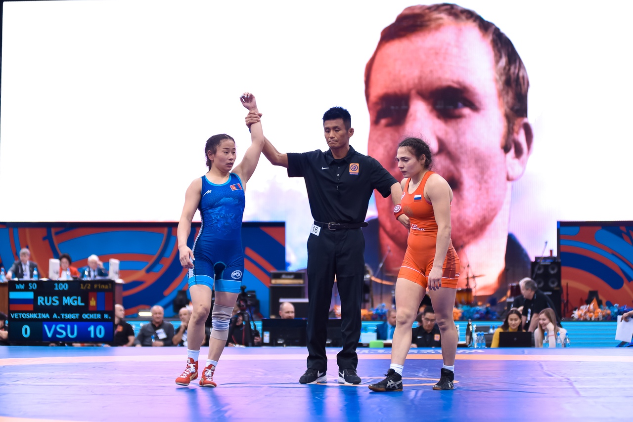 Энэ жинд 18 бөх барилдсан бөгөөд Ц.Намуунцэцэг өчигдөр 1/8 шигшээд Казахстаны Светлана Анкичева, шөвгийн наймд Узбекистаны Даулетбик Яхшимуратова, хагас шигшээд эзэн орны Анжелика Ветошкинаг тус бүр оноогоор цэвэр ялсан билээ. Тэгвэл дөнгөж сая шигшээ барилдаанд 23 хүртэлх насны ДАШТ-ий хошой хүрэл медальт ОХУ-ын Надежда Соколоватай хүч үзэв. Манай бөх түүнд сүүлийн хоёр жилийн хугацаанд гурван удаа барилдахад бүгдэд нь ялагдаад байсан.