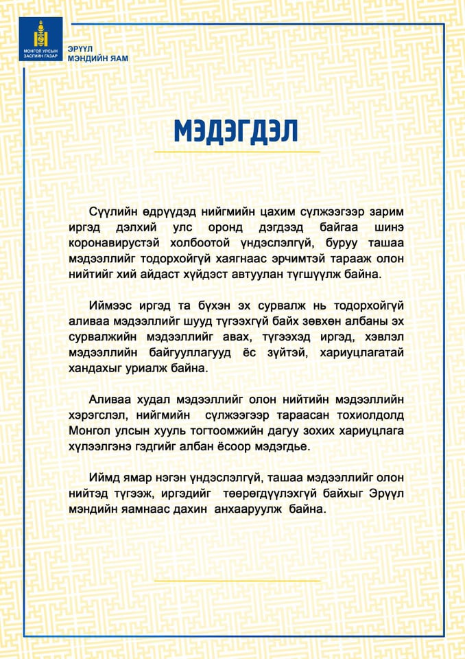 Сүүлийн өдрүүдэд зарим иргэн нийгмийн цахим сүлжээгээр дэлхийн улс орнуудад дэгдээд байгаа шинэ коронавирусын халдвартай холбоотой үндэслэлгүй, ташаа мэдээлэл түгээх нь ихэссэн. Үүнтэй холбогдуулан Монгол Улсын Эрүүл мэндийн яамнаас мэдэгдэл гаргаж, дээрх тохиолдолд хариуцлага хүлээлгэнэ гэдгийг анхаарууллаа.