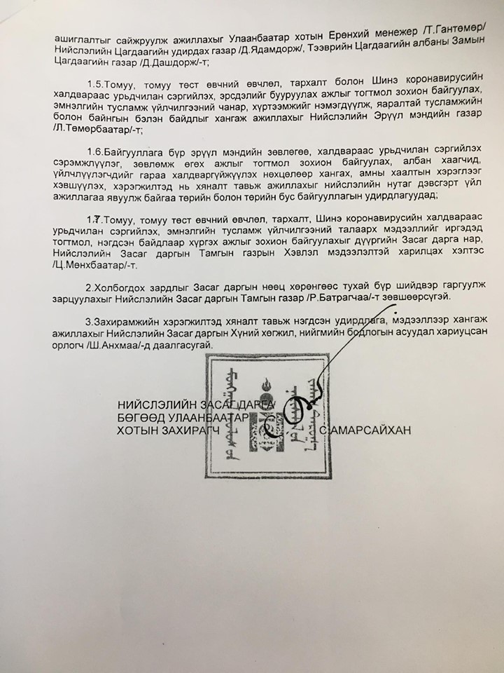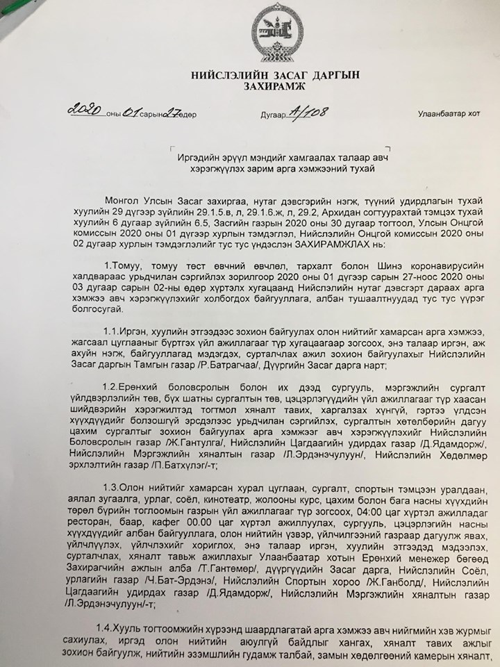 Захирамжид “Томуу, томуу төст өвчний өвчлөл, тархалт болон шинэ коронавирусийн халдвараас урьдчилан сэргийлэх зорилгоор 2020 оны 01 дүгээр сарын 27-ноос 2020 оны 03 дугаар сарын 02-ны өдөр хүртэлх хугацаанд Нийслэлийн нутаг дэвсгэрт дараах арга хэмжээ авч хэрэгжүүлэхийг холбогдох байгууллага, албан тушаалтнуудад тус тус үүрэг болгосугай” гэжээ.