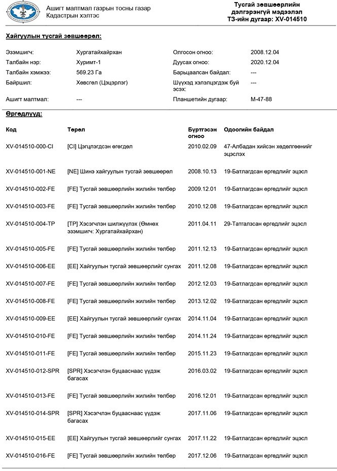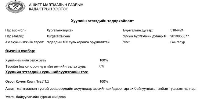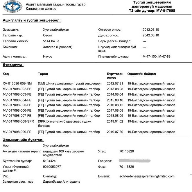 “Аспайр майнинг” компанийн эзэмшлийн лицензүүдийн хуулийн этгээдийн тодорхойлолттой танилцана уу. Хуримт-1 XV-014510, Овоот MV-017098 дугаартай тусгай зөвшөөрөл нь Сингапур улсын 100 хувийн хөрөнгө оруулалттай “Хургатай хайрхан” ХХК-ийн захирал Д.Ачит-Эрдэнэ гэх хүний нэр дээр байдаг юм байна. XV-014510 Хуримт-1 тусгай зөвшөөрлийн талбайн хэмжээ нь 569.23 га бөгөөд 2008 онд анх 20 жилийн хугацаатайгаар авчээ. Харин MV-017098 дугаартай Овоотын нүүрсний ордын тусгай зөвшөөрлийн талбайн хэмжээ нь 5144.04 га талбай бөгөөд 2042 он хүртэл 30 жилийн хугацаатай эзэмшиж байна.