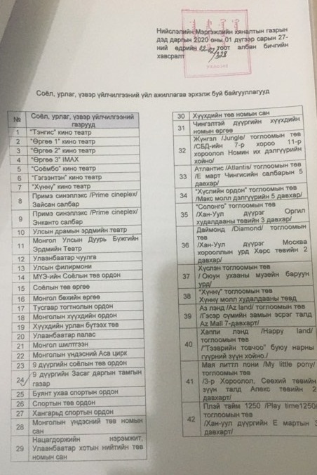 Мөн өмчийн аливаа хэлбэрийг үл харгалзан 197 сургууль, 457 цэцэрлэг, их дээд сургууль, мэргэжлийн сургалт үйлдвэрлэлийн төв 95, жолооны курсууд, кино театр, номын сан, хүүхдийн тоглоомын төвүүд зэрэг урлаг соёлын 42 байгууллага, интернет цахим тоглоомын 167 газрын үйл ажиллагааг зогсоох, томоохон сургалтын танхимтай 76 ресторан, зочид буудлуудын захиргаанд олныг хамарсан үйл ажиллагааг 2020 оны 03 сарын 02-ны өдрийг дуустал зохион байгуулахгүй байх талаар мэдэгдэл хүргүүлж биелэлтэнд хяналт тавьж ажиллаж байна.