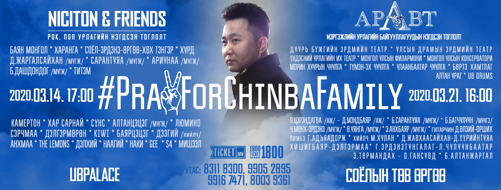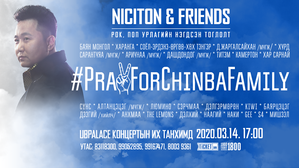"PrayForChinbaFamily" хандивын аяны хүрээнд зохион байгуулж буй "Niciton & Friends" тоглолт 2020 оны гуравдугаар сарын 14-ний өдөр 17:00 цагаас "Улаанбаатар палас"-ын концертын Их танхимд болох аж.