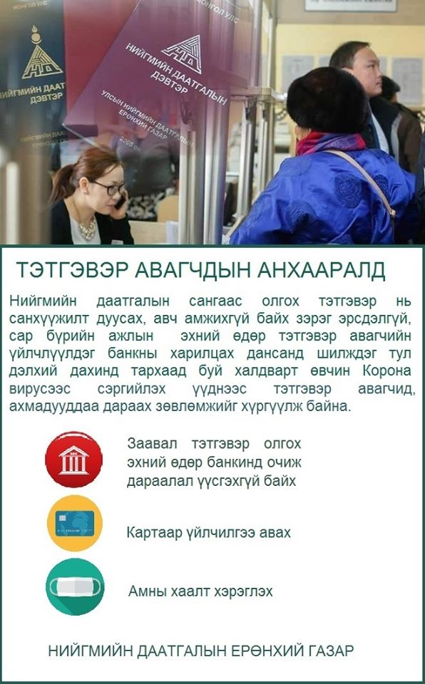 Нийгмийн даатгалын сангаас олгох тэтгэвэр нь санхүүжилт дуусах, авч амжихгүй байх зэрэг эрсдэлгүй. Тиймээс сар бүрийн ажлын эхний өдөр тэтгэвэр авагчийн үйлчлүүлдэг банкны харилцах дансанд шилжих тул дэлхий дахинд тархаад буй тархаад буй халдварт өвчин Коронавирусээс сэргийлэх үүднээс тэтгэвэр авагчид, ахмадууддаа дараах зөвлөмжийг өгч байна.