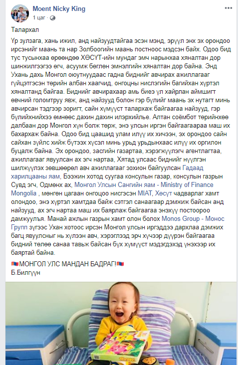 Тэгвэл БНХАУ-ын Ухань хотоос 31 оюутны хамт ирсэн бяцхан хүүгийн аав Б.Билгүүр өөрийн цахим хуудаснаа талархал илэрхийлжээ.