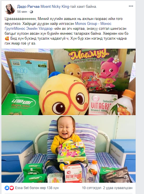 Манай ажлын газрын хамт олон болох Monos Group - Монос Групп зүгээс Ухань хотоос ирсэн Монгол Улсын иргэддээ дархлаа дэмжих багц явуулсныг нь хүлээн авч, хэрэглээд эрч хүчээр дүүрэн байгаагаа бидний төлөө санаа тавьж байсан бүх хүмүүст мэдэгдэхэд үнэхээр их баяртай байна.