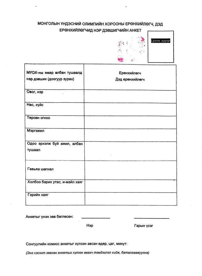 Иймд МҮОХ-ны Ерөнхийлөгч, Дэд ерөнхийлөгчид нэр дэвших хүсэлтэй гишүүн нь нэр дэвшигчийн анкетыг бөглөж, өөрийн товч танилцуулгын хамт