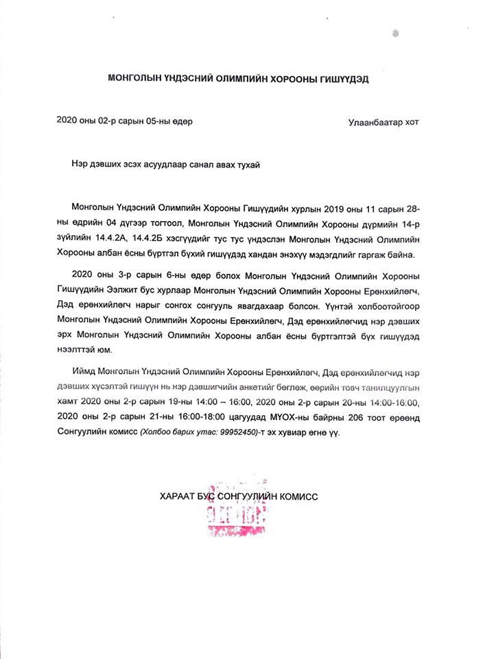 Монголын үндэсний олимпийн хороо /МҮОХ/-ны хараат бус сонгуулийн комиссоос МҮОХ-ны гишүүдэд хандан "Нэр дэвших эсэх асуудлаар санал авах тухай" мэдэгдэл гаргажээ.