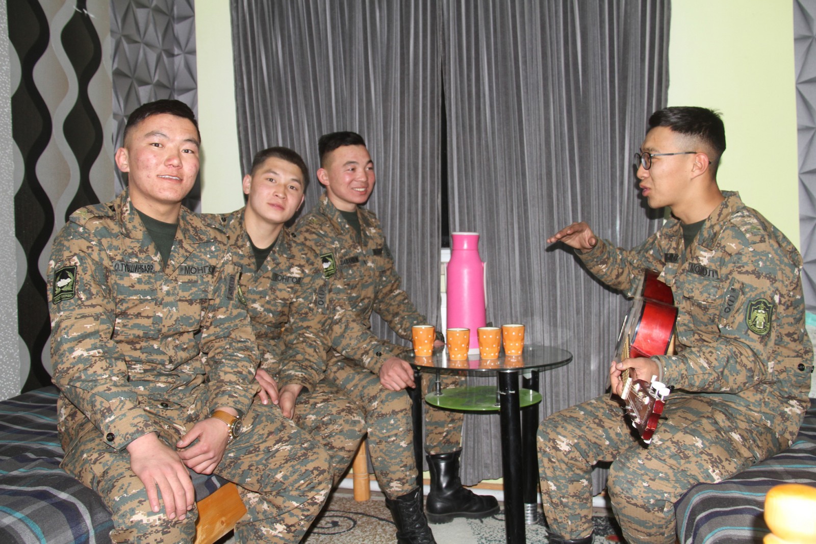 “За танайд зочильё” гэвэл мань дөрөв сандарч байгаа бололтой өөд өөдөөсөө харан инээлдэв. Болоогүй нүдээрээ хоорондоо ирмэлцэж байна. Ингээд хоёр нь гарч одов. Нэг нь гал тогооноос чацаргана, нөгөө нь хаанаас ч юм хоосон байсан тавгаа чихрээр дүүргэн маасайтал инээсээр буцаж орж ирэв. “За хаанаас дээрэмдчихэв” гэж наргивал асуудалгүй гээд инээлдлээ. За ингээд цай ууж, идээг нь идсэн зочны ёсоор тэдэнтэй танилцав. Залуус хилийн харуулаас бууж ирээд гурав хонож байгаа аж. ХЦАХ-аас гэрээт хилчид нэг шат ахисан гэсэндээ тэд илэн далангүй, чөлөөтэй үзэл бодлоо илэрхийлнэ. Магадгүй яриа хөөрөө сайтай дөрөвтэй ч таарсан уу бүү мэд. Тус өрөөний ах нар нь О.Түвшинбаяр, Б.Мянганмягмар хоёр. Нэг жил, нэг сар албаа амжилттай хааж байгаа аж. Харин өрөөний хамгийн отгон нь гэрээт хилчин, байлдагч Б.Давааням өнгөрсөн оны есдүгээр сард гэрээт хилчин болж тус салбарт томилогдон иржээ. Гэрээт хилчин, байлдагч Б.Галбадрахын хувьд заставт томилогдон ирээд таван сар болж байгаа гэнэ. Гэхдээ тэд бие биедээ ахархаж ихэрхээд байх зүйл үгүй. Нэгэн үеийн залуусын хувьд амь нэгтэй, их дотно болох нь яриа өрнөхөөс эхлээд мэдрэгдэв.