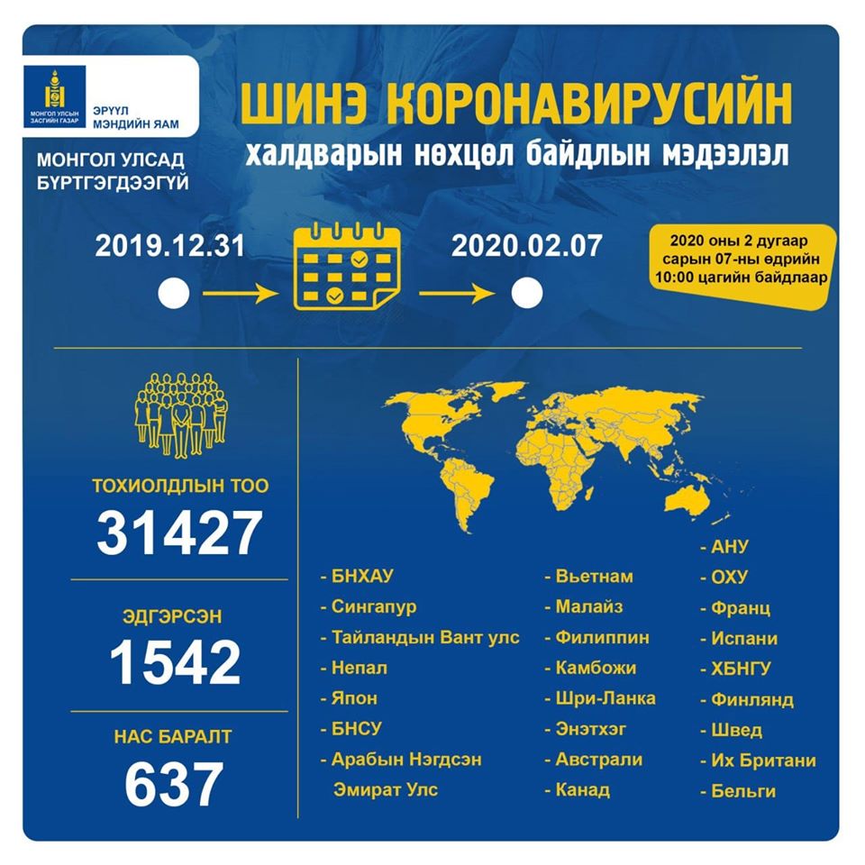Эрүүл мэндийн яамнаас шинэ коронавирусийн халдварын нөхцөл байдлын мэдээллийг 2020 оны хоёрдугаар сарын 07-ны 10:00 цагийн байдлаар мэдээллээ.