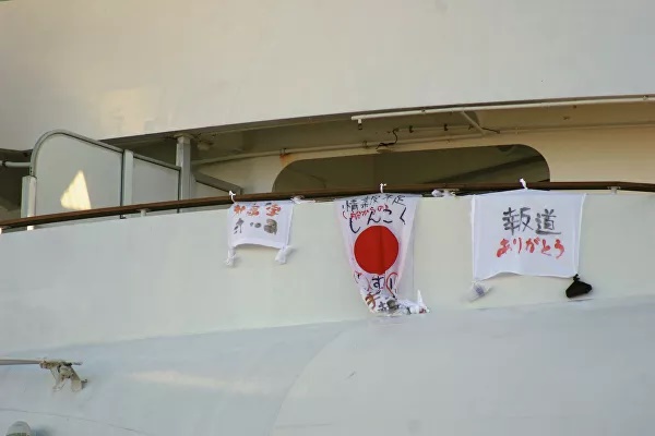 Зорчигчид усан онгоцны тавцан дээр “Ноцтой нөхцөл байдал-эм!” гэсэн эм авчрах хүсэлт бүхий бичиг мөн “Хэвлэлийнхэнд баярлалаа” гэсэн бичиг өлгөсөн байна.
