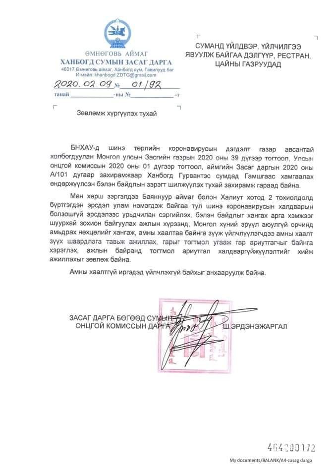 Өмнөговь аймгийн Ханбогд суман дах Гашуунсухайт боомттой хиллэдэг БНХАУ-ын Халиут хотод буюу Гашуунсухайтаас 120 километрийн зайтай нутаг дэвсгэрт коронавирусийн хоёр тохиолдол бүртгэгдсэнтэй холбогдуулан Өмнөговь аймгийн Ханбогд, Гурвантэс суманд гамшгаас хамгаалах өндөржүүлсэн бэлэн байдал зарлажээ. Энэ тухай захирамжийг сумын Засаг дарга өчигдөр /2020.02.09/ гаргасан байна.