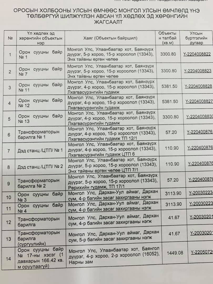 Өөрөөр хэлбэл, Засгийн газрын өнөөдрийн /2020.02.12/ ээлжит хуралдаанаар ОХУ-ын өмчлөлд байсан Монгол айл, өрхүүдийн түрээслэдэг 550 гаруй орон сууцны барилгыг эдгээр айл, өрхүүдэд өмчлүүлэх шийдвэрийг гаргалаа. Түүнчлэн Улаанбаатар, Дархан дахь дэд станцуудын болон бусад зургаан обьектыг ОХУ-ын өмчлөлөөс Монголын төрийн өмчлөлд үнэгүй шилжүүлж байгаа аж.