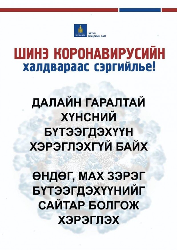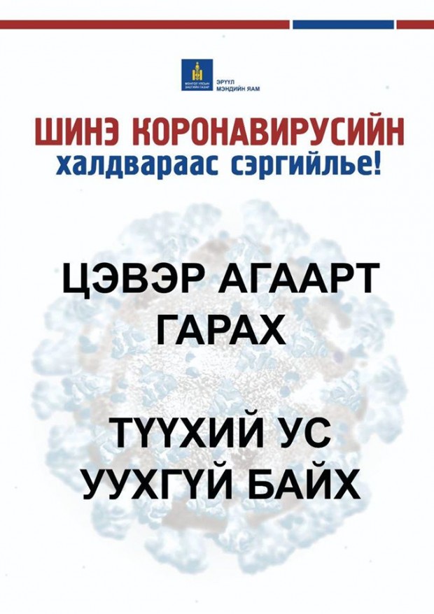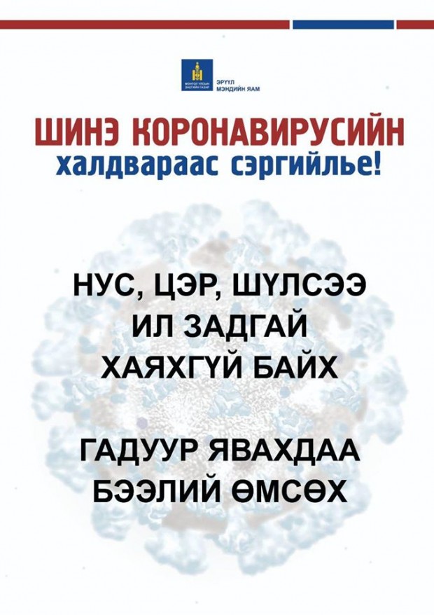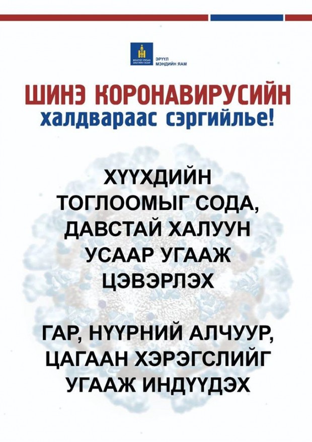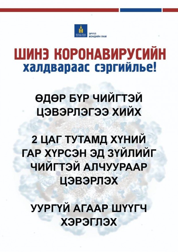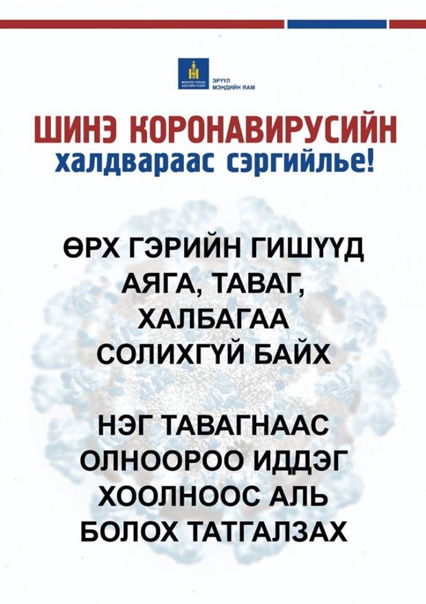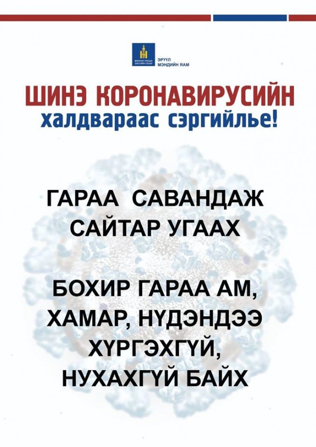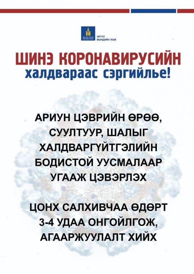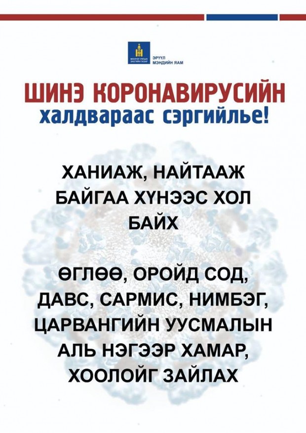 Мөн та бохир гараараа ам, хамар, нүдэндээ хүрэхгүй, нухахгүй байх, өдөрт сод, давс, нимбэг, царвангийн аль нэг уусмалаар хамар хоолойгоо зайлахыг зөвлөж байна.
