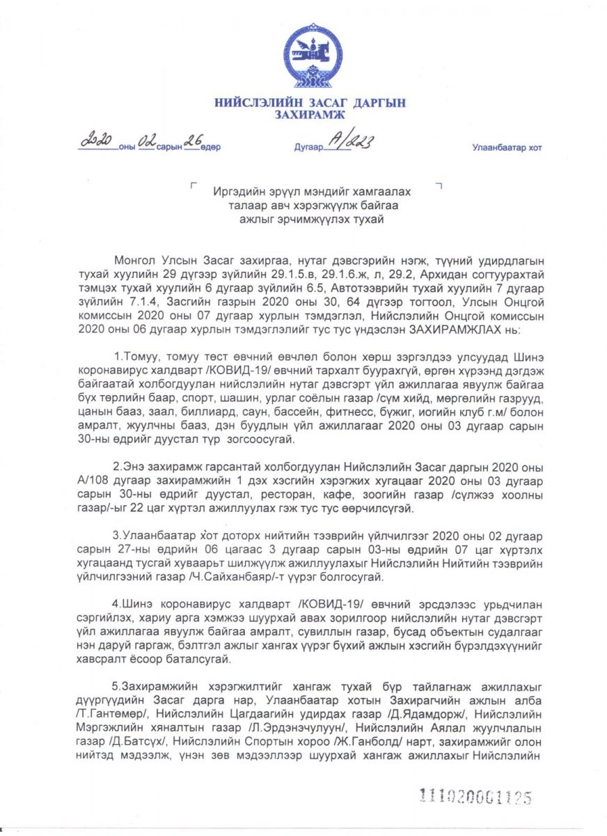 Нийслэлийн Засаг даргын өнөөдөр гаргасан захирамж (БҮРЭН ЭХЭЭРЭЭ)