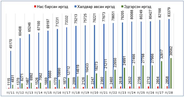 БНХАУ-д 02 дугаар сарын 28-ны өдрийн 12:00 цагийн байдлаар 78.832 хүн халдвар авсан болох нь тогтоогдож 2.788 хүн амь насаа алдаад байна. Мөн 36165 хүн эдгэрч эмнэлгийн хяналтаас гарсан байна.