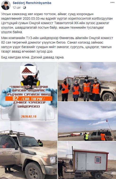 Улсын хэмжээнд хөл хорио тогтоож, аймаг, сумд хоорондын хөдөлгөөнийг 2020.03.03-ны өдрийг хүртэл хориглосонтой холбогдуулан Цогтцэций сумын Онцгой комисст Тавантолгой ХК-ийн зүгээс дэмжлэг үзүүлэн, шаардлагатай постын байр, машин техникийн туслалцааг үзүүлж байна.