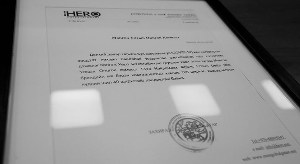 “Херо энтертайнмент” болон “Монгол тулгатны зуун эрхэм төсөл”-ийн хамт олны зүгээс Бүгд Найрамдах Франц Улсын “Delta Plus” брэндийн иж бүрэн хамгаалалтын 200 ширхэг хувцас, хамгаалалтын 40 ширхэг шилийг Монгол Улсын Шадар сайд, Улсын онцгой комиссын дарга Т.Энхтүвшинд гардуулан өглөө.
