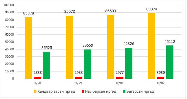 Өнгөрсөн сарын 28-наас 03 дугаар сарын 02-ны 15:00 цагийн хооронд Шотланд, Чех, Армен, Доминикан, Ирланд, Люксембург, Катар, Эквадор Улсад коронавирусын халдвар шинээр бүртгэгдэж, БНСУ, Италид халдварын тархалт хурдацтай нэмэгдэж дэлхийн нийт 64 улсад бүртгэгдээд байна. Олон улсын хэмжээнд 03 дугаар сарын 02-ны өдрийн 15:00 цагийн байдлаар 89074 хүн халдвар авч, 3050 хүн амь насаа алдаад байна. Үүнийг сүүлийн 3 хоногтой харьцуулан үзвэл: