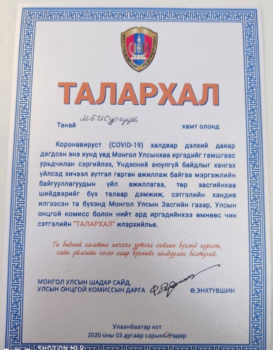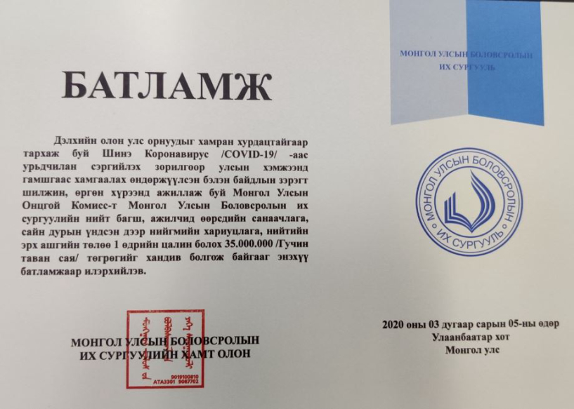 Дэлхийн олон улс, орныг хамран хурдацтайгаар тархаж буй КОВИД-19 халдвараас урьдчилан сэргийлэх зорилгоор улсын хэмжээнд гамшгаас хамгаалах өндөржүүлсэн бэлэн байдлын зэрэгт шилжин, өргөн хүрээнд ажиллаж буй Монгол Улсын Онцгой Комисст Монгол Улсын Боловсролын их сургуулийн нийт багш, ажилтан, албан хаагчид нэг өдрийн цалингаа амжилт хүсэн хандивлаж байгаа нь энэ.