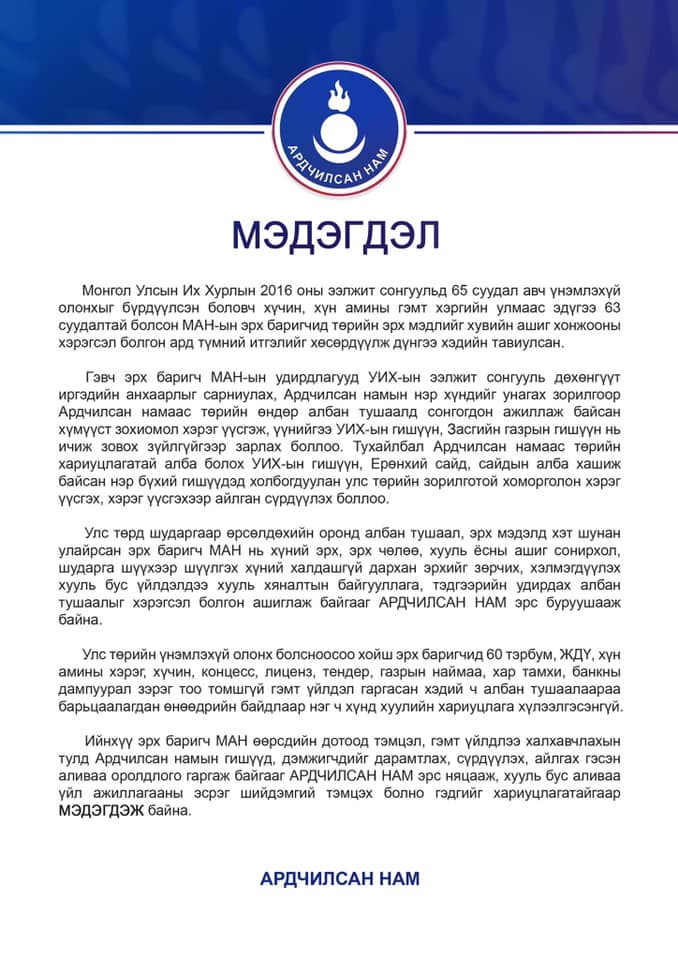 АН-аас төрийн хариуцлагатай алба болох УИХ-ын гишүүн, Ерөнхий сайд, сайдын алба хашиж байсан нэр бүхий гишүүдэд холбогдуулан хэрэг үүсгэх, хэрэг үүсгэхээр айлган сүрдүүлж байгаа нь хууль бус үйлдэл болохыг АН-аас мэдэгдэл гарган илэрхийлсэн байна.