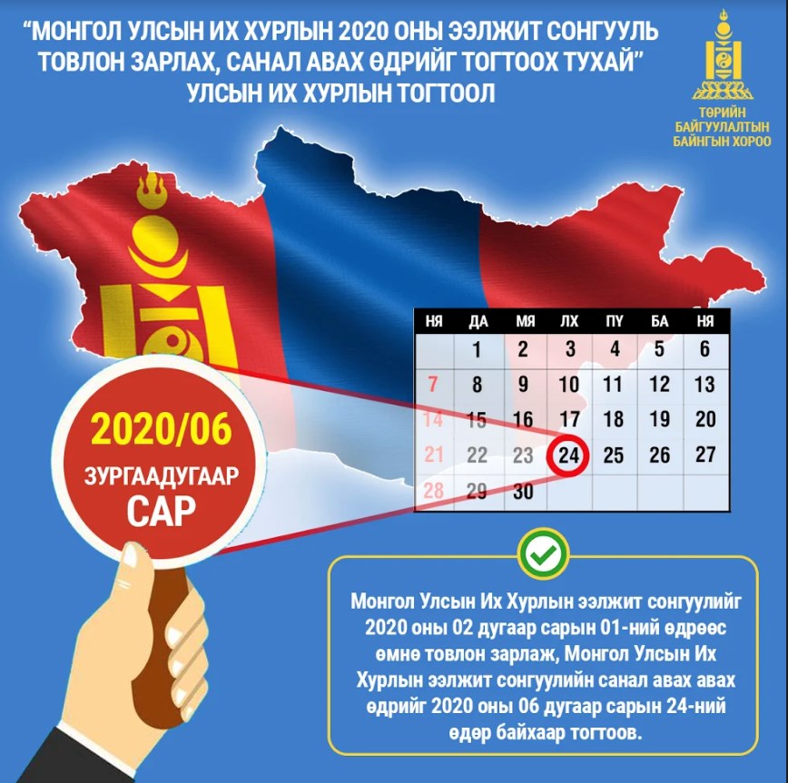 Мөн зүйлийн 9.2-т “Ээлжит сонгуулийн санал авах өдөр нь ээлжит сонгуулийн жилийн зургаадугаар сарын сүүлийн хагасын аль нэг ажлын өдөр байна” гэж заасны дагуу ээлжит сонгуулийн санал авах өдрийг 2020 оны зургаадугаар сарын 24-ний өдөр байхаар “УИХ-ын 2020 оны ээлжит сонгууль товлон зарлах, санал авах өдрийг тогтоох тухай” тогтоолыг баталсан байдаг.